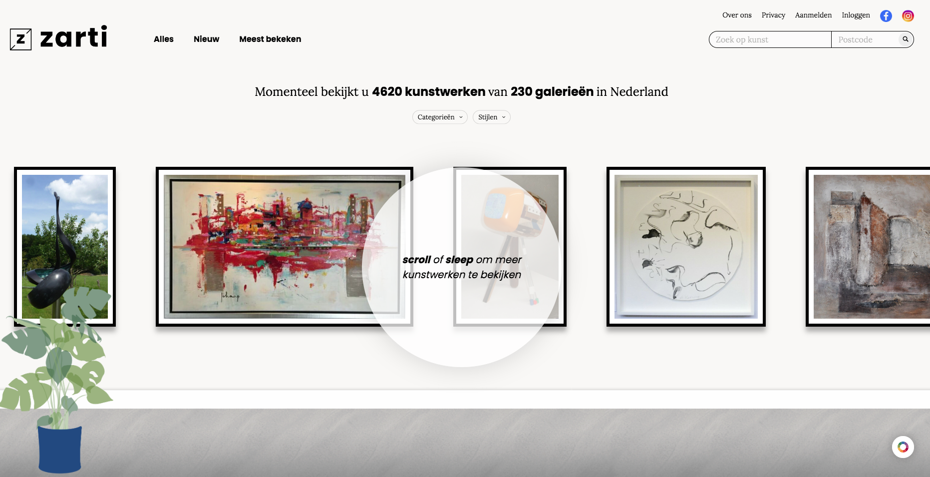 Na mijn tijd bij Gadero was het voor mijn gevoel tijd voor echt iets heel anders. Andere branche, andere mensen, andere ideeën. Meer dan 10 jaar terug had ik al eens het idee iets met kunst te doen. Ik wou mij onderscheiden door een spider te maken die alle aangeboden kunstobjecten van gerenommeerde kunstgalerieën in kaart bracht. Een soort “Gaspendaal.nl (verzamelsite met alle aanbod van tweedehands auto’s)” voor een nieuw schilderij of kunstbeeld zeg maar. Ik liet deze site zarti.nl bouwen ergens 2020.