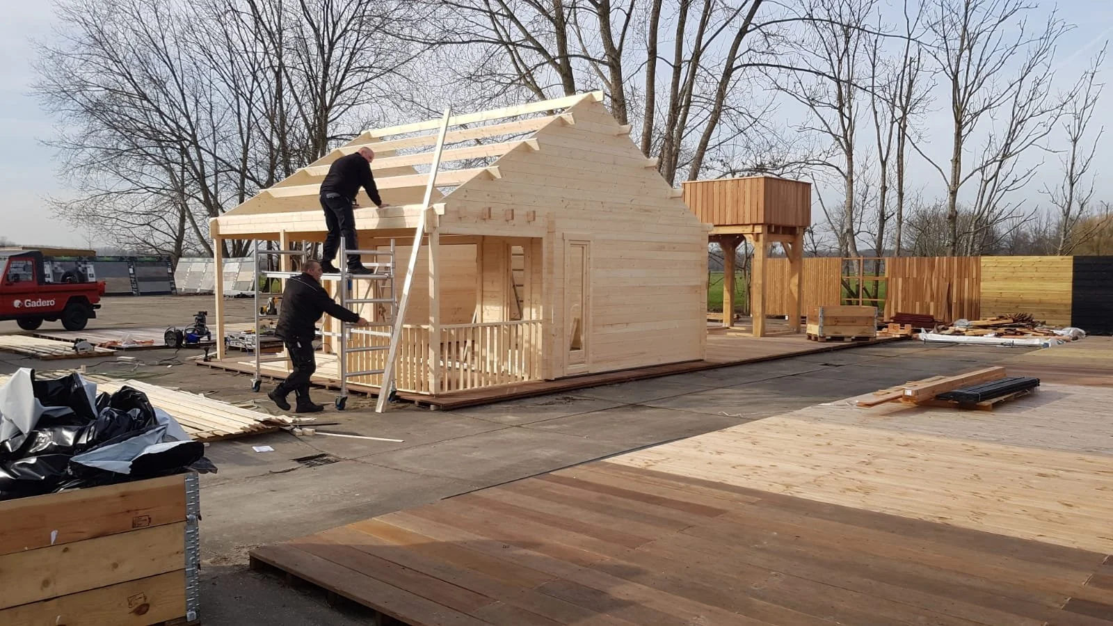 Opbouw van de eerste blokhut op het showterrein in Breukelen