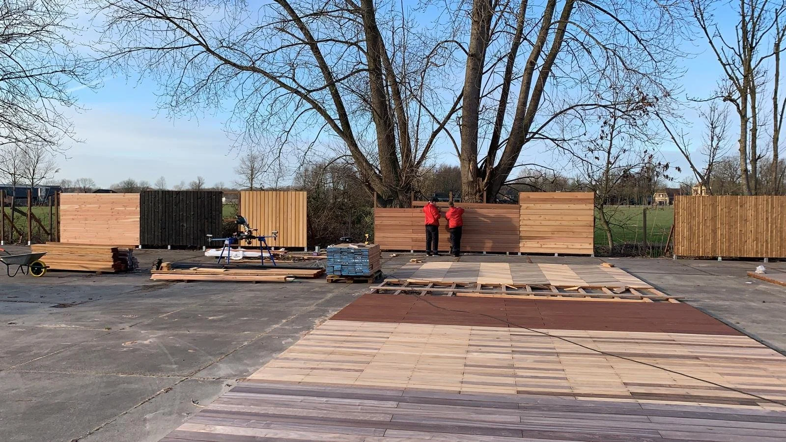 Opbouw showroom in Breukelen met vlonders, schuttingen en later ook tuinhuisjes, houten veranda’s en aluminium overkappingen.