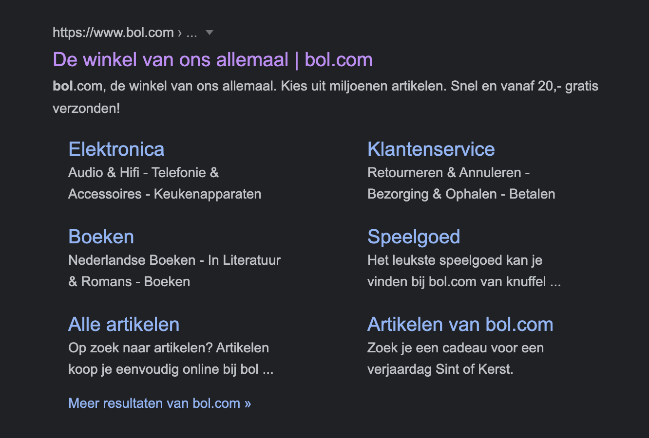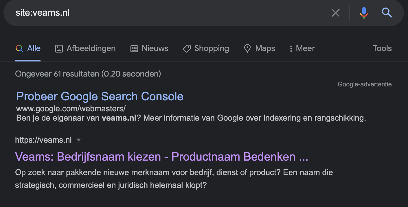 Is iets nu een goede website of niet? Heeft een website nu status in Google of niet? Als je zoekt op de url van de site en je ziet dat de website inspringingen heeft (ook wel sitelinks genoemd), dan weet je dat Google de site status geeft. Hoe meer inspringen hoe beter. Zoek je op de url van een blog en je vindt de blog niet helemaal bovenaan dan is het of een hele nieuwe blog of een spamblog. Let op, advertenties (google ads) kunnen ook sitelinks hebben, dat is niet wat ik bedoel